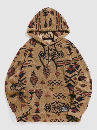 Quarter Zip Pocket Ethnic Aztec Tribal Print Pullover Fuzzy Hoodie